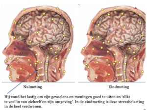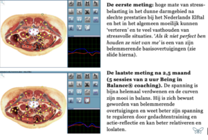 Aanvankelijk toonde de Body & Mind Scan een hoge stressbelasting in het darmgebied, wat overeenkwam met de moeite die de voetballer had met het verwerken van kritiek en stress. Zijn belemmerende overtuiging “Als ik niet perfect ben, houden ze niet van me” werd geïdentificeerd als een kernpunt. Na 2,5 maand van ‘Being in Balance®’ coaching lieten de scans een beduidende afname van stress en een gebalanceerde fysiologische staat zien. De voetballer had belangrijke stappen gezet in zelfbewustzijn en stressregulatie, wat hem hielp bij het relativeren en loslaten van druk.